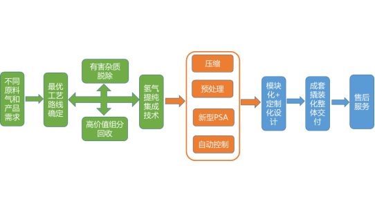 通過整合各種先進(jìn)、成熟的工藝技術(shù),選擇最優(yōu)的工藝技術(shù)路線,開發(fā)了各種先進(jìn)成熟的硬件設(shè)備、控制系統(tǒng)和嵌入式工藝技術(shù)于一體,模塊化撬裝供貨,生產(chǎn)出質(zhì)優(yōu)價廉的工業(yè)氫或氫能產(chǎn)品,滿足了不同用戶需求。