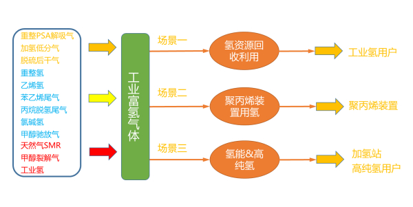 應(yīng)用場景:三種典型場景包括由工業(yè)富氫氣體提純至工業(yè)氫,聚丙烯用氫,高純氫、燃料電池用氫。